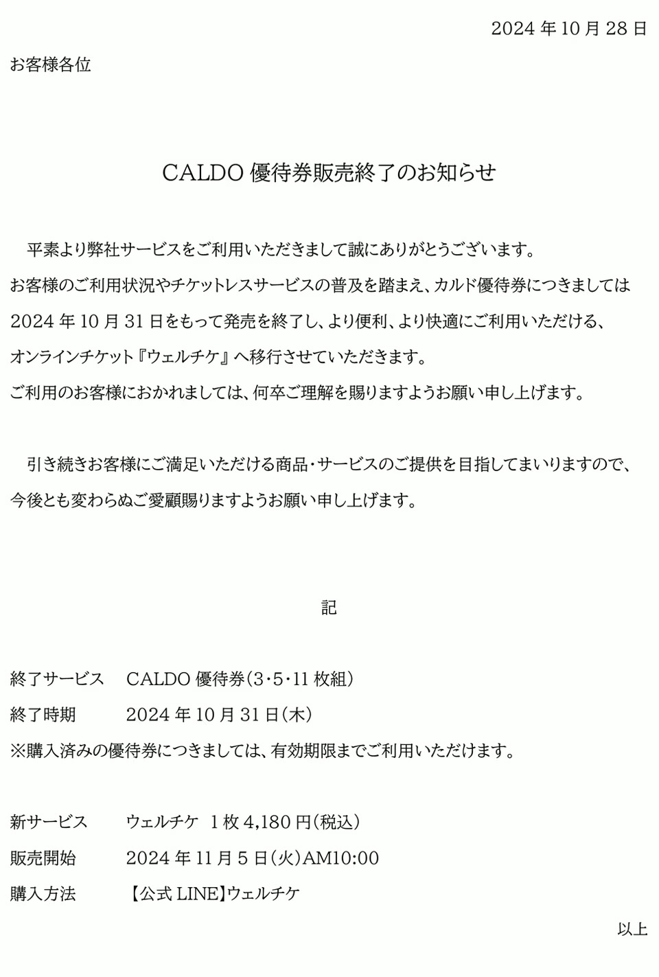 優待券販売終了のご案内