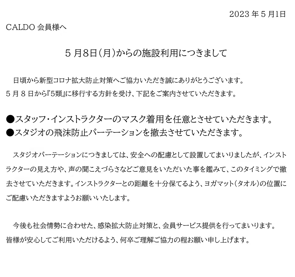 5月8日(月)からの施設利用につきまして