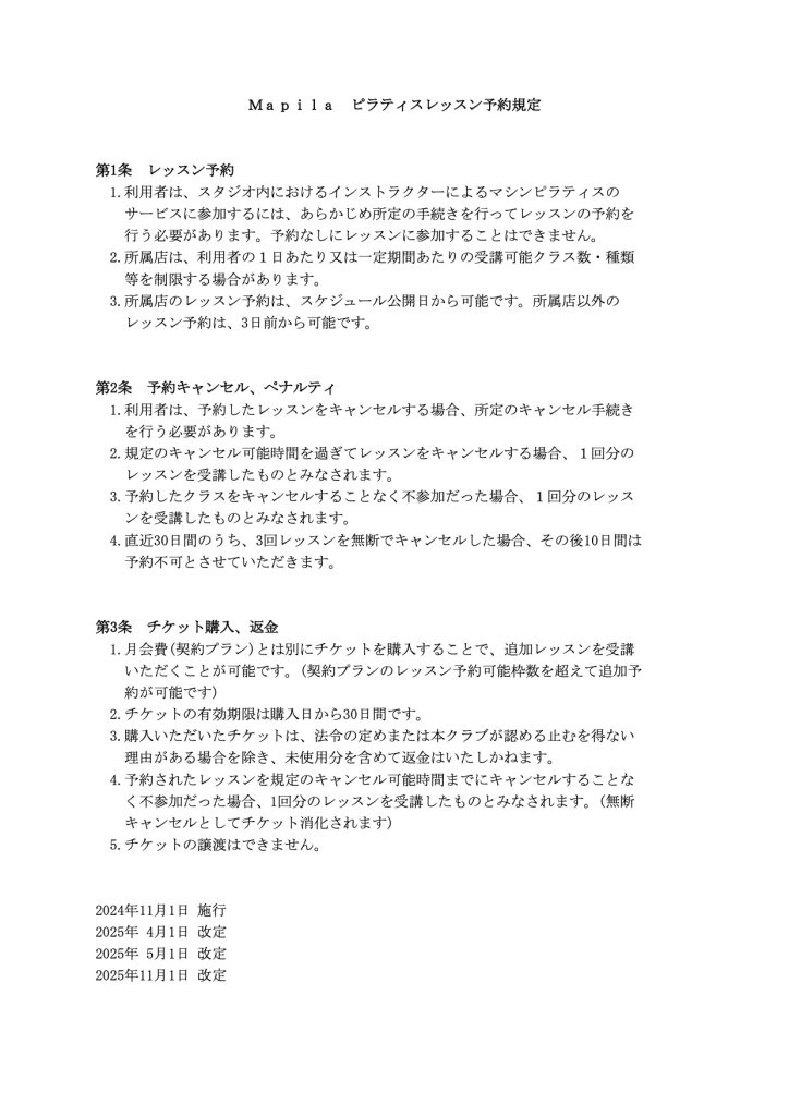 Mapila ピラティスレッスン予約規約
