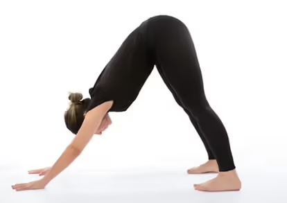 1. 肩の下に手首、股関節の下に膝の四つ足の状態から、手のひら1枚分前に歩かせ、ゆっくりとお尻を天井に突き上げる