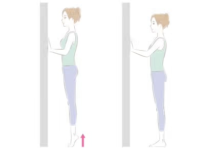 2. 壁に手をついたまま、左右の足のかかとを上げ下げする