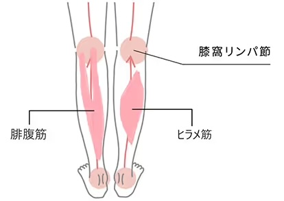ふくらはぎには大きく2つの筋肉があります。それが腓腹筋とヒラメ筋です。また、ふくらはぎを含む周辺筋肉や、つま先から足首にかけての指の筋肉等で発生した疲労物質を排出する為、膝裏の「膝窩リンパ節」も重要です。