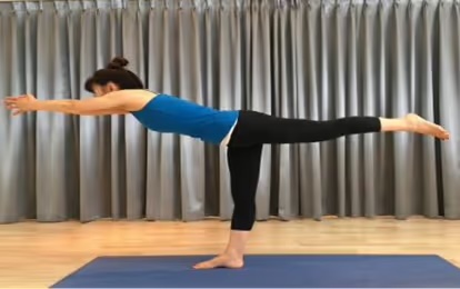 ・英雄のポーズⅢ:片足を後ろに伸ばし、上半身を前に倒したバランスポーズです。