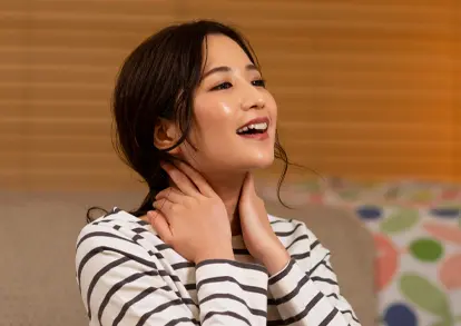 次は少し顔を上げて両手を使ってフェイスラインから鎖骨にむかってマッサージします。とてもリンパが多い所でもあるので、4本の指を揃えて首にあてたままくるくると刺激するか、グーの手をあてて刺激するのもオススメです。肩や鎖骨に向かって場所を変えながら行ってみましょう。