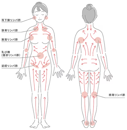 リンパは血液のようなポンプ機能がなく筋肉の動きによって動きますが、リンパケアを行うことで流れを促進させることができます。