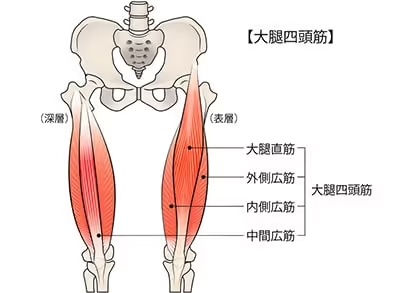 太ももの前面にある股関節から膝まで伸びている筋肉で、「大腿直筋」「内側広筋」「外側広筋」「中間広筋」の4つの筋肉のことを総称して呼びます。