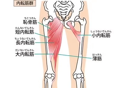 太ももの内側にある筋肉で、「恥骨筋」「短内転筋」「長内転筋」「大内転筋」「薄筋」の5つの筋肉の総称です。(またの名を「内点筋群」)。主に脚を閉じる役割があります。