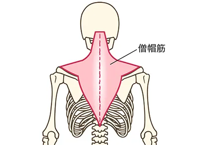 大きな縦長のひし形をしており、上部・中部・下部とそれぞれ機能が分かれています。首の後面に対し広く分布していて、最も表層にあるので体脂肪の少ない人の背中を観察すれば、実際の形も確認しやすいです。
