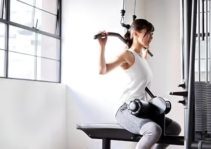背中のトレーニングとして有名なこちら。マシンを使用し、上から引っ張る背中のトレーニングです。肩甲骨と上腕骨には関連性があり、腕の骨が動くとき、連動して肩甲骨も動き、肩周りの血流を良くしてくれます。