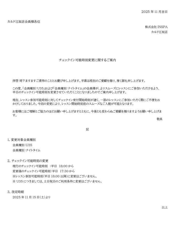 U35・ナイトタイム会員様のチェックイン時刻の変更