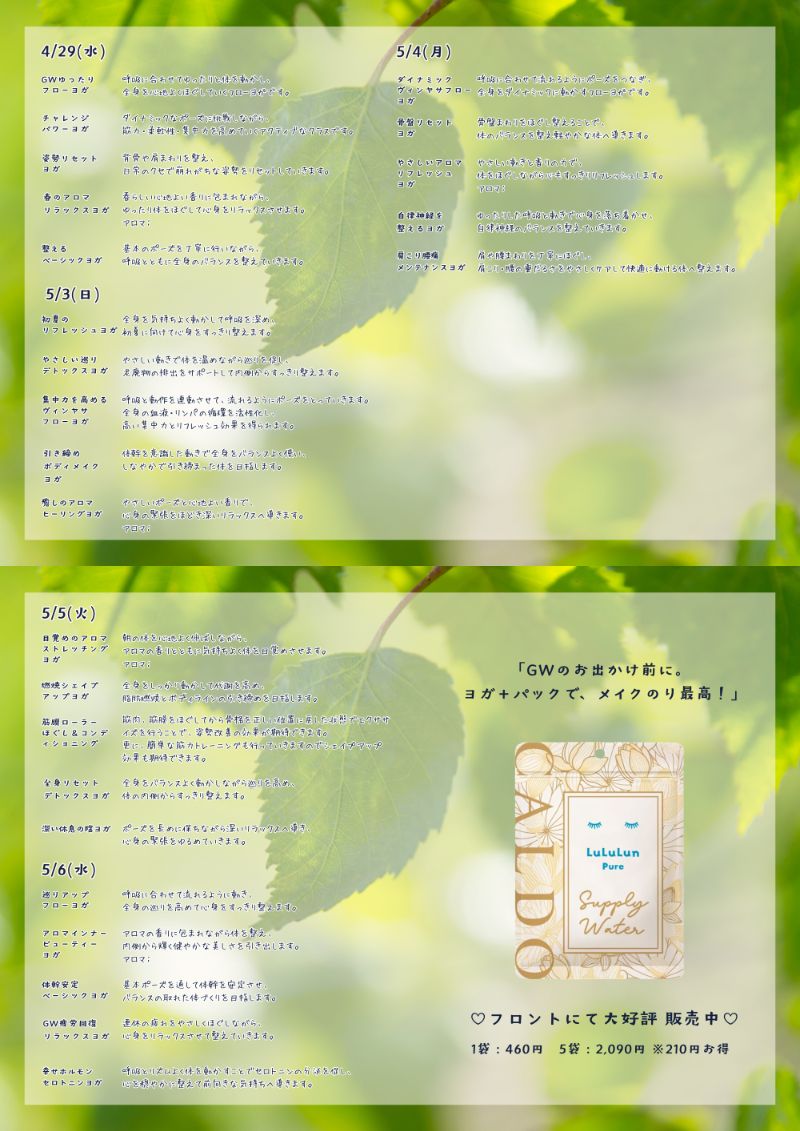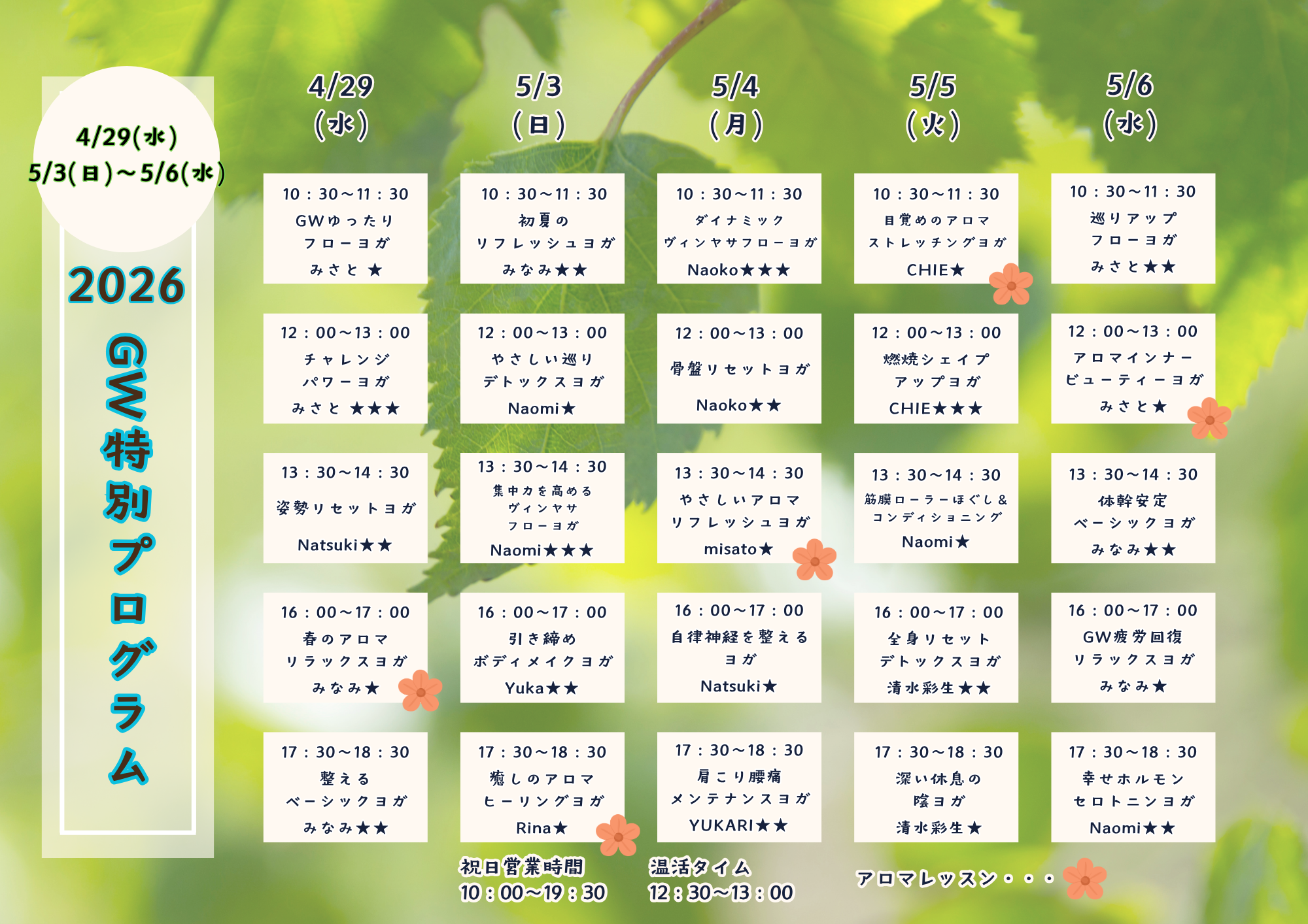 体調を総合的に整えることを目的としたプログラムです。 呼吸とともに体をダイナミックに動かし、緊張した筋肉を伸ばすポーズを中心に行います。 体の緊張がほぐされることでリンパの流れがスムーズになり、不要なものが排出されやすいデトックス効果が高まります。