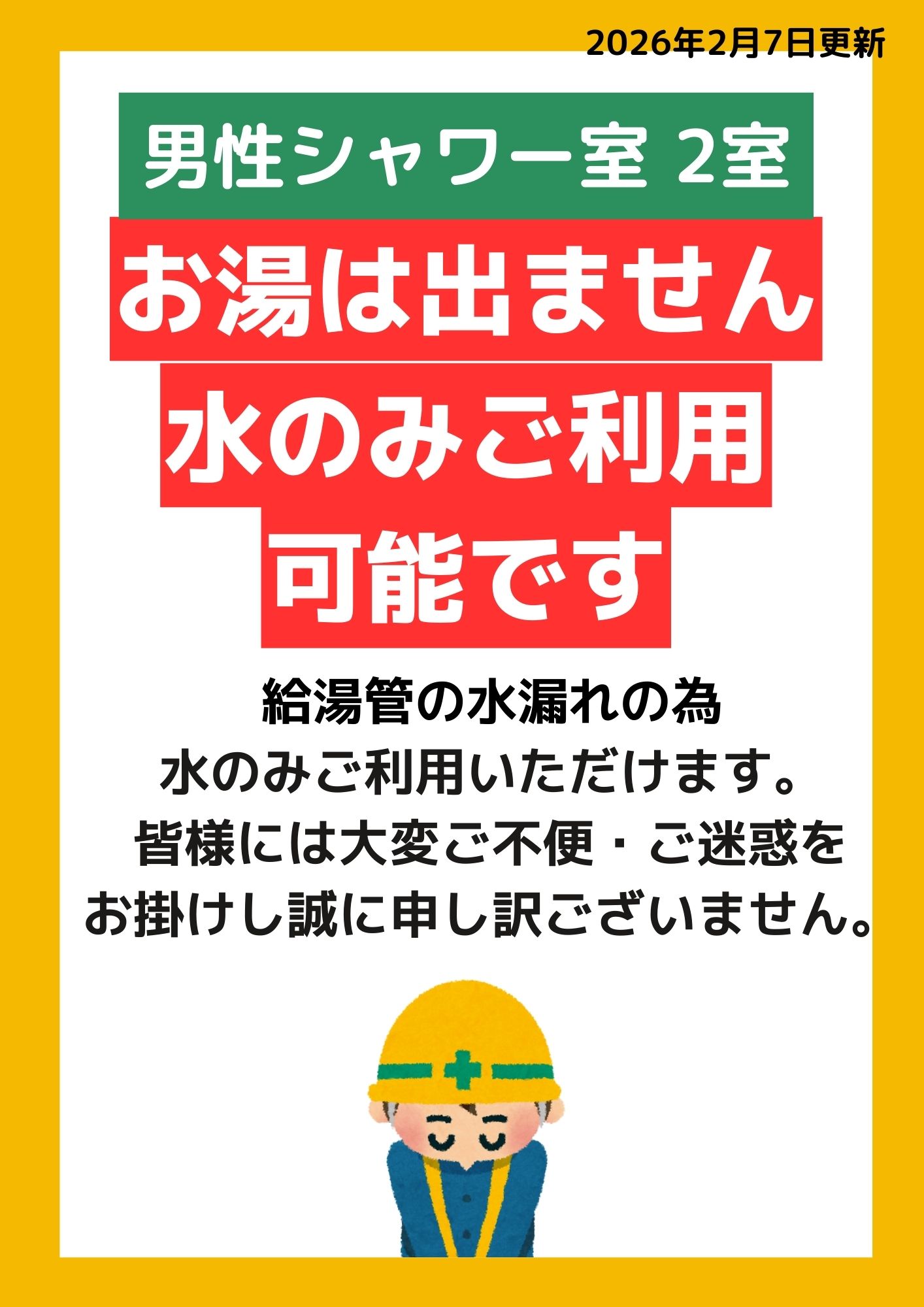 【お知らせ】男性シャワー室 2室 ※お湯がでません 修繕が完了するまで少々お時間を頂戴します。
