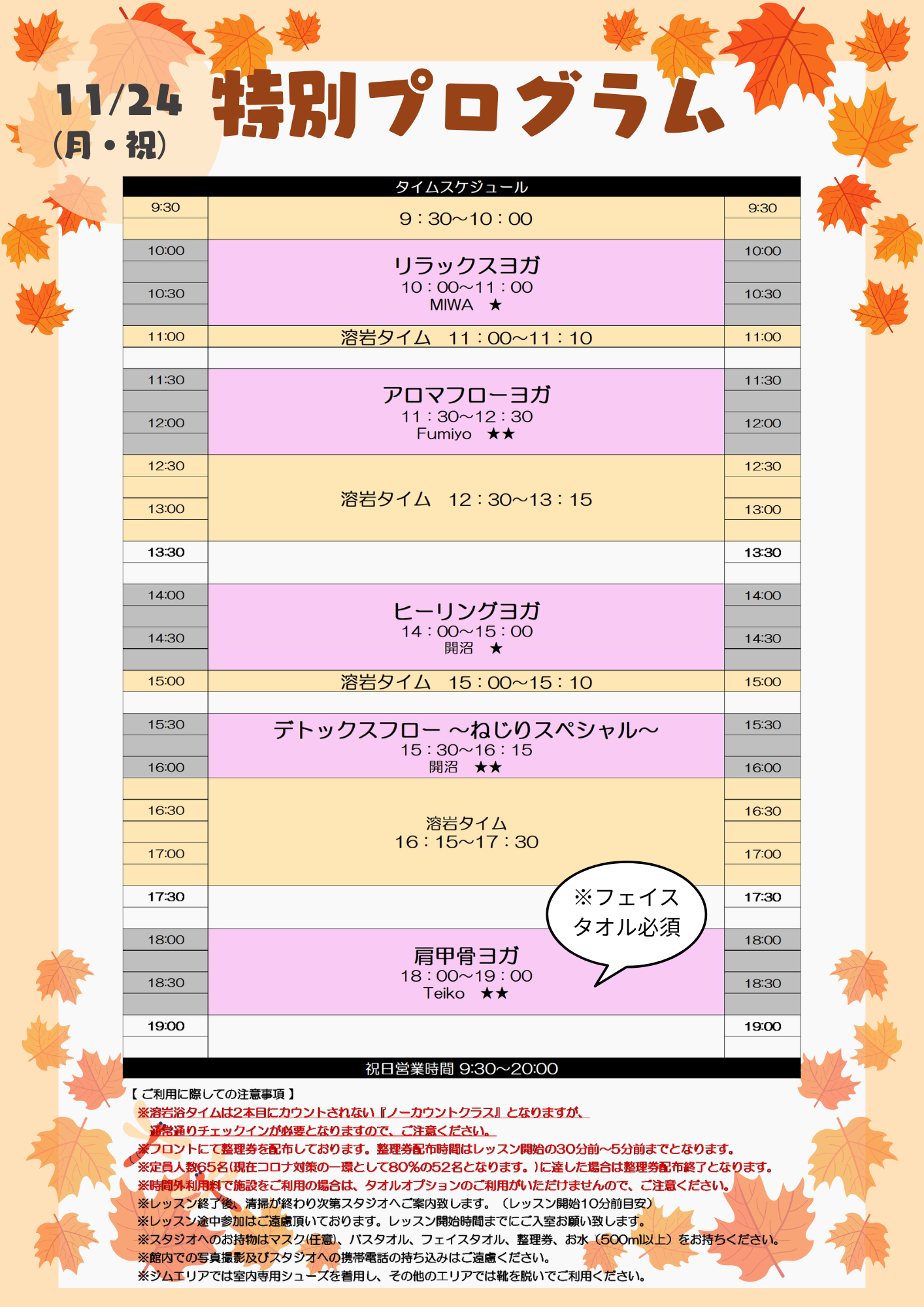 いつもよりゆったりとした呼吸に動きを合わせて心と体の声に耳を傾け疲れや緊張をほぐします。