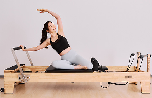 リフォーマーを乗りこなしアクティブに全身を動かしていきます。 全身の引き締め、姿勢改善、スポーツのパフォーマンスUPなど、理想の身体に近づけるレッスンです。