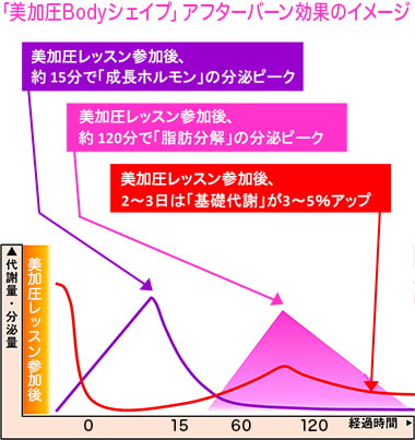 短時間で効果の期待できる加圧エクササイズでは、アフターバーン効果によって代謝の高い状態が続くと、通常よりも多くのカロリーが消費されるようになります。レッスン後約15分で成長ホルモンが分泌ピークとなり、約60分後には脂肪分解が開始されます。120分後にピークを迎えた後、持続したアフターバーンが24〜72時間ほど持続するともいわれています。