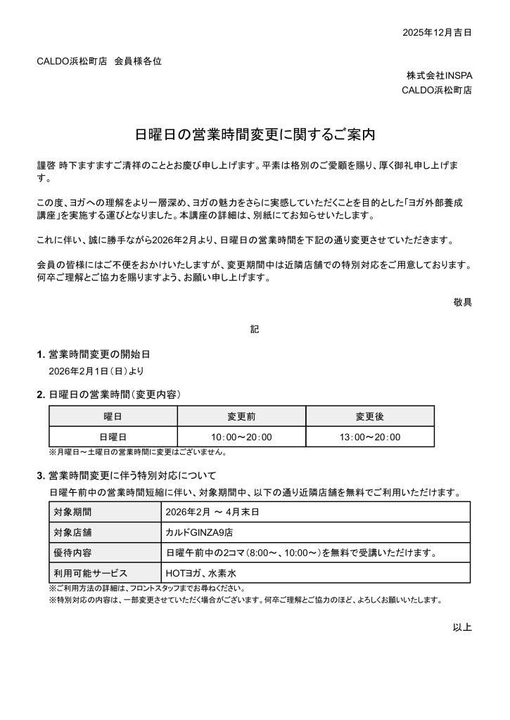 2月~ 日曜の営業時間について