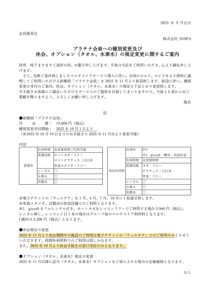 重要なお知らせ(休会・オプションについて)