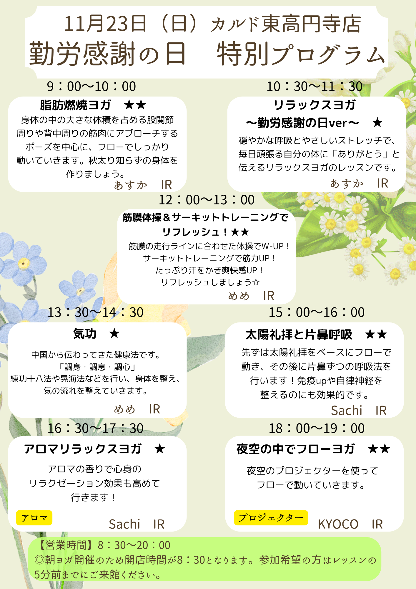 ホットヨガによる血液やリンパの流れを促進する効果に加え、ホルモンバランスの安定や美肌効果、たるみ解消など様々な角度からのボディケアを目的としたプログラムです。難度は低めに設定していますので、初心者でも安心して受講することができます。