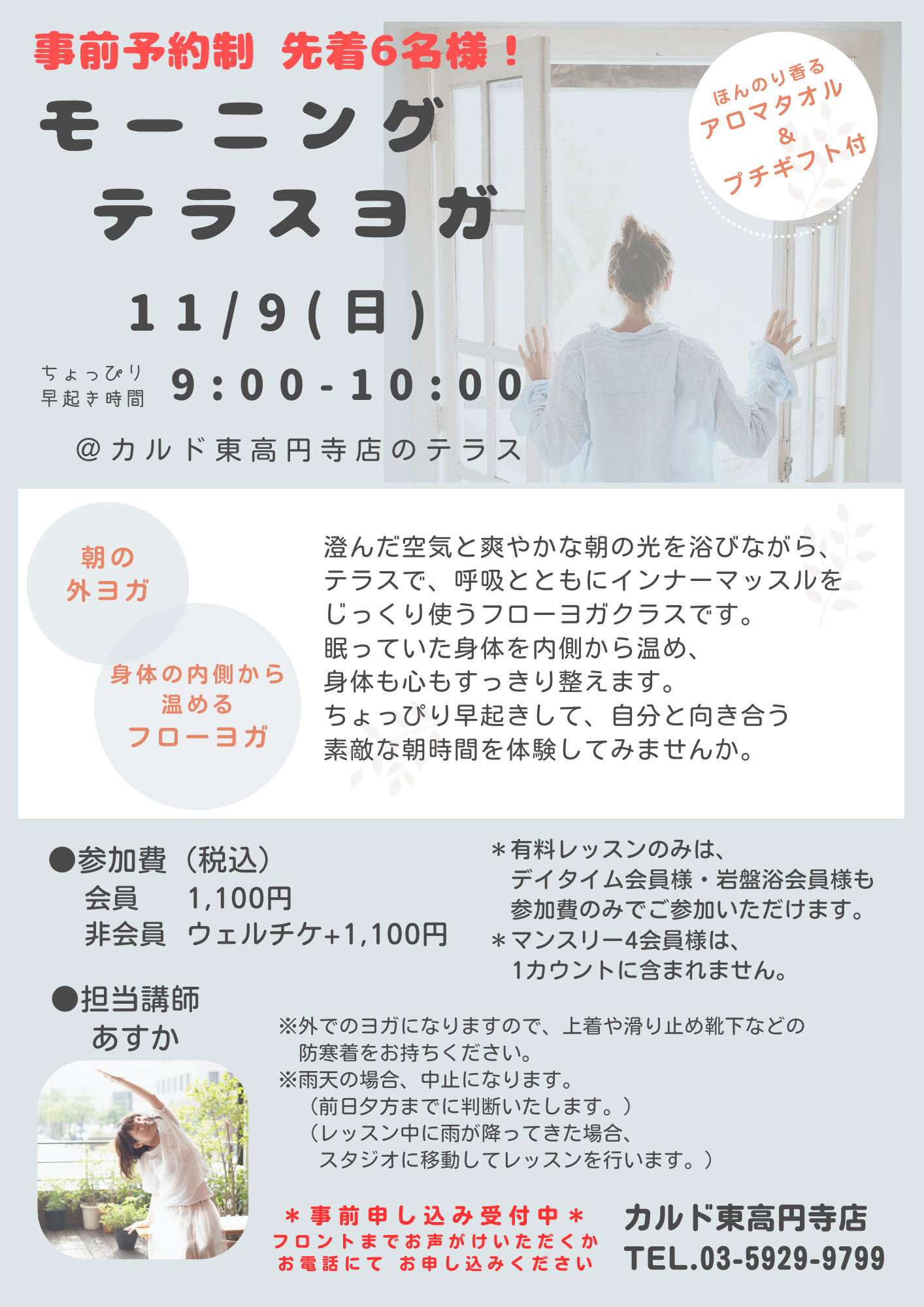 少ないポーズをゆっくり流れるように動いていきます。運動に自信のない方やヨガを始めたばかりの方でも安心してご参加頂けます。