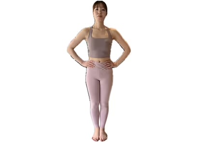1. 両足の裏をしっかりとマットにつけて立ち、両手を腰にあてる