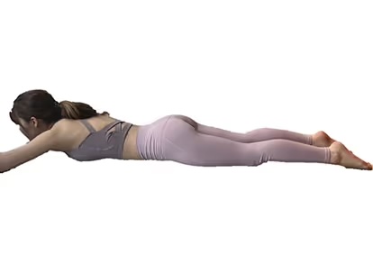 1. うつ伏せになりあごを床につけます。両足は揃えるか腰幅に開き、両腕は身体に沿って伸ばし、手のひらを床に向けます。