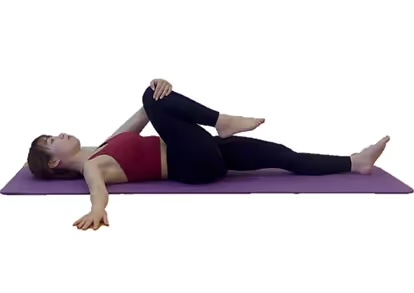 2. 右膝を曲げ、両手で膝を抱えて胸に引き寄せます。