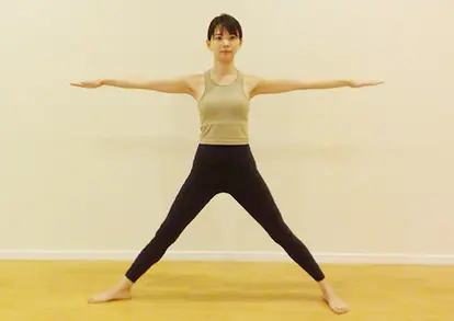 1:まっすぐに立ち、息を吐きながら両足を大きく開きます。両足の幅は肩幅より広げます。