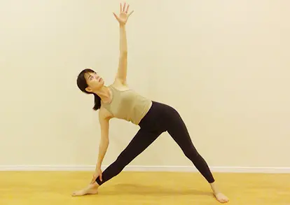 「三角」(三角形)のポーズは、上体を倒し、ウエストをぐっと強く伸ばすスタンディング(立位)のポーズです。