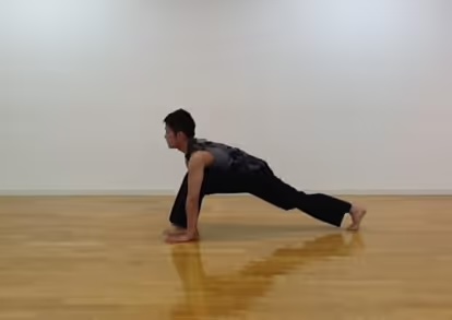 1. 右足を前方に曲げ、左足はまっすぐ後ろに伸ばします。
