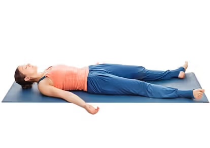2. 両手は体の横やお腹の上におき、肩の外側と首の後ろを床につけて軽く目を閉じます。