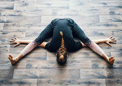 マットの上で長座になります。 両膝を立てます。足幅は肩幅より広め(肩幅の1.5倍くらい)に開きましょう。 両手を足の間につき、指先は外側へ向けましょう。右手は右側、左手は左側で 膝の下におきましょう。 息を吸って背筋を伸ばし、ゆっくりと吐きながら腕を横方向に伸ばしながら前屈させていきます。慣れている方は斜め後ろ方向に腕を伸ばしましょう。 同じタイミングで少しずつ膝を伸ばしましょう。 気持ち良く伸びを感じる所でストップし深い呼吸を繰り返します。余裕がある方は上半身をマットへおろし、顎をつけます。 完成形がとれたら深く3~5呼吸しましょう。息を吸いながらゆっくりと膝を曲げ腕を引き抜き、身体を起こします。