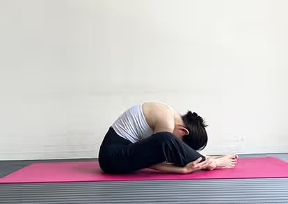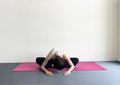 がっせき前屈のポーズは足裏を合わせて座り、かかとを身体に引き寄せます。つま先を持ち股関節から身体を倒して前屈するポーズです。股関節を刺激し、お尻と腰背部が伸びます。