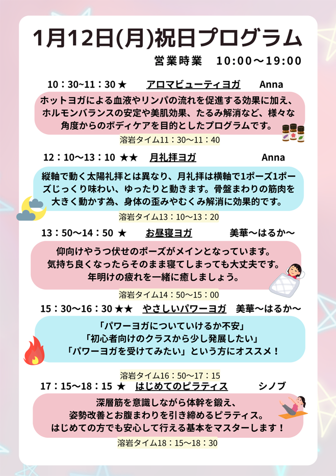 ホットヨガによる血液やリンパの流れを促進する効果に加え、ホルモンバランスの安定や美肌効果、 たるみ解消など、さまざまな角度からのボディケアを目的としたプログラムです。 難度は低めに設定していますので、初心者でも安心して受講する事ができます。