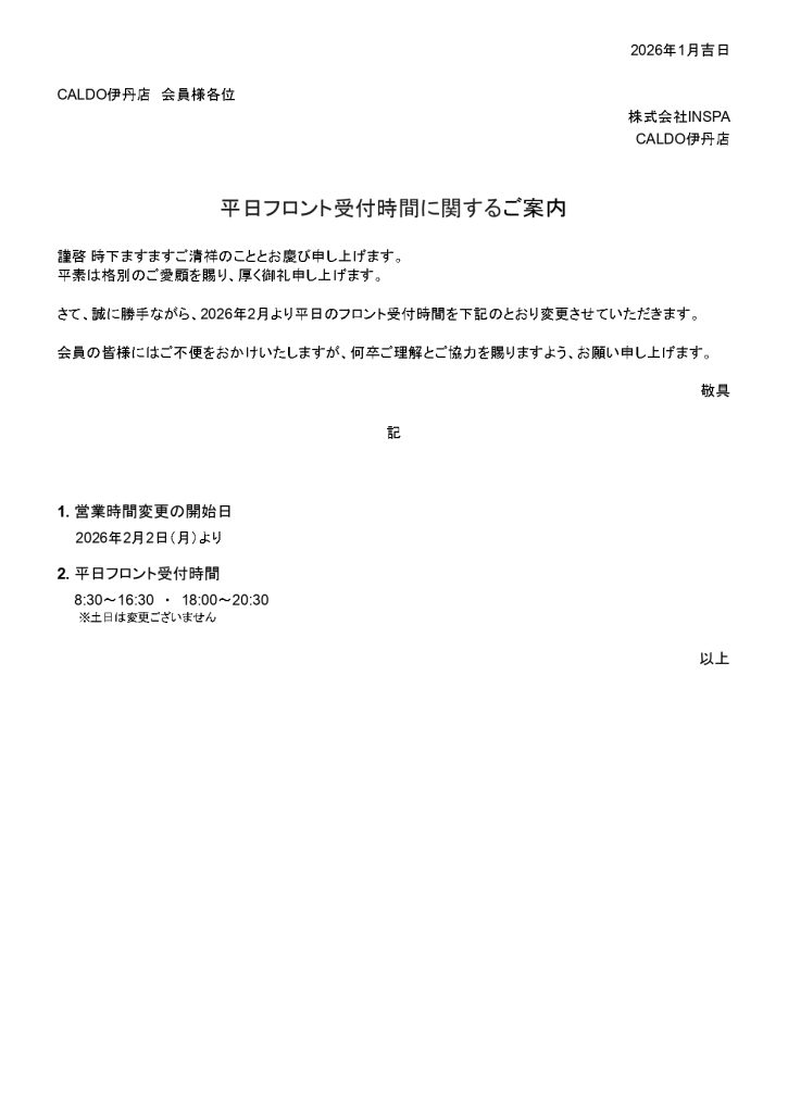 平日フロント受付時間に関するご案内