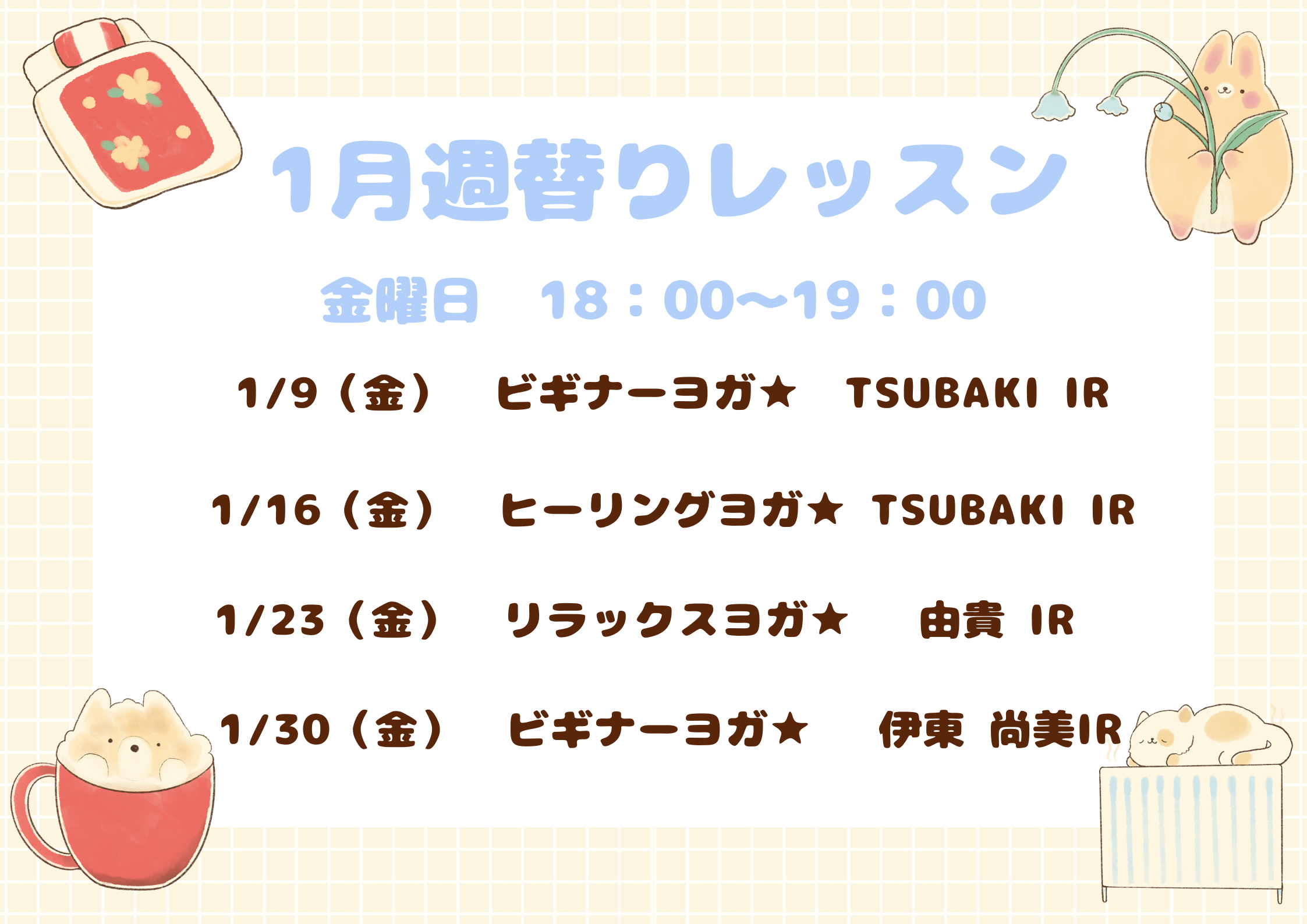 基本のポーズを中心にゆっくりとすすめていくプログラム。側屈・ねじり・片足バランスなどまべんなく身体を動かしていきます。