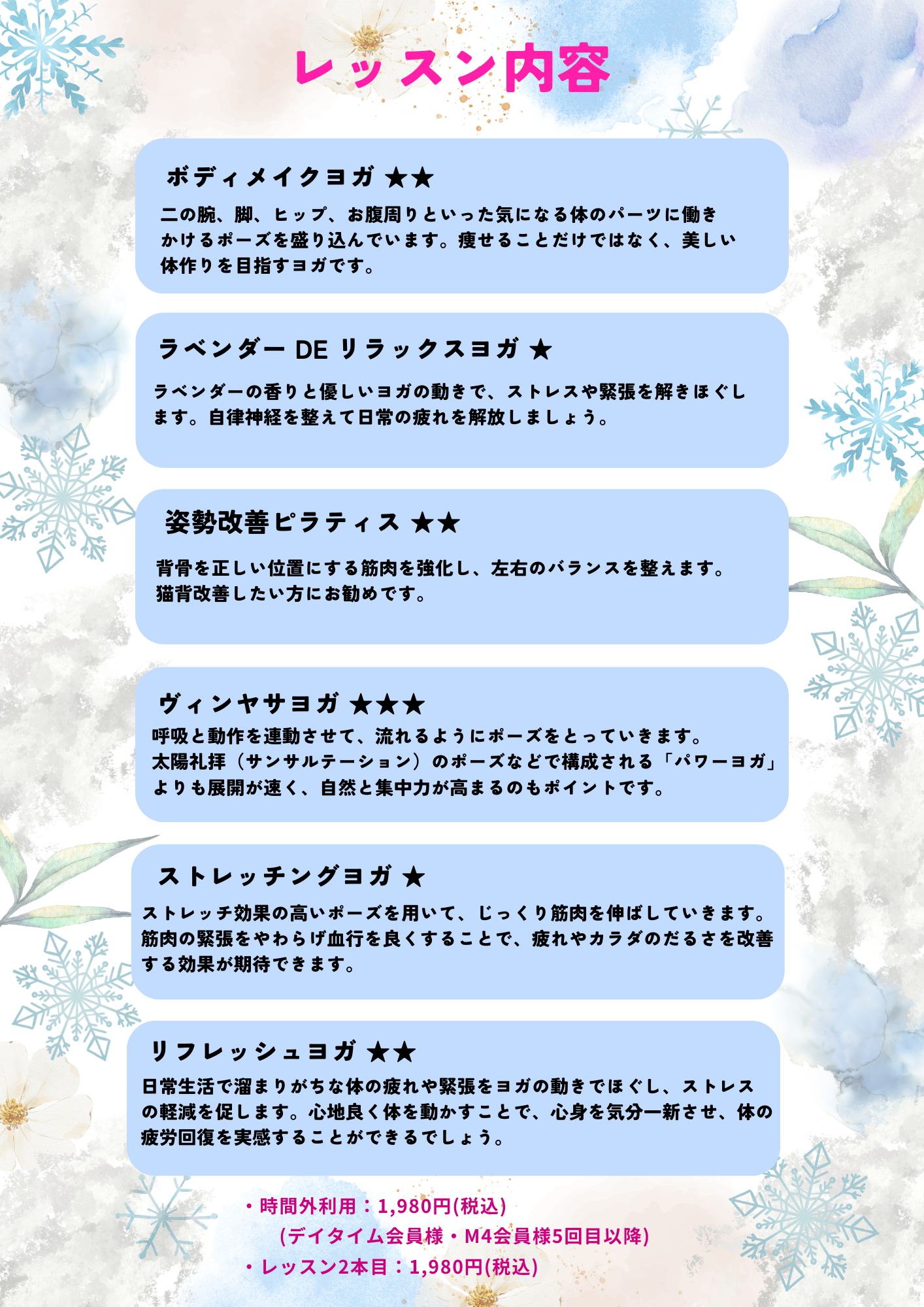 初心者がヨガに親しめるようなプログラムです。一つ一つのポーズをゆっくり丁寧に行いながら呼吸法やヨガの魅力を知ることができるクラスです。