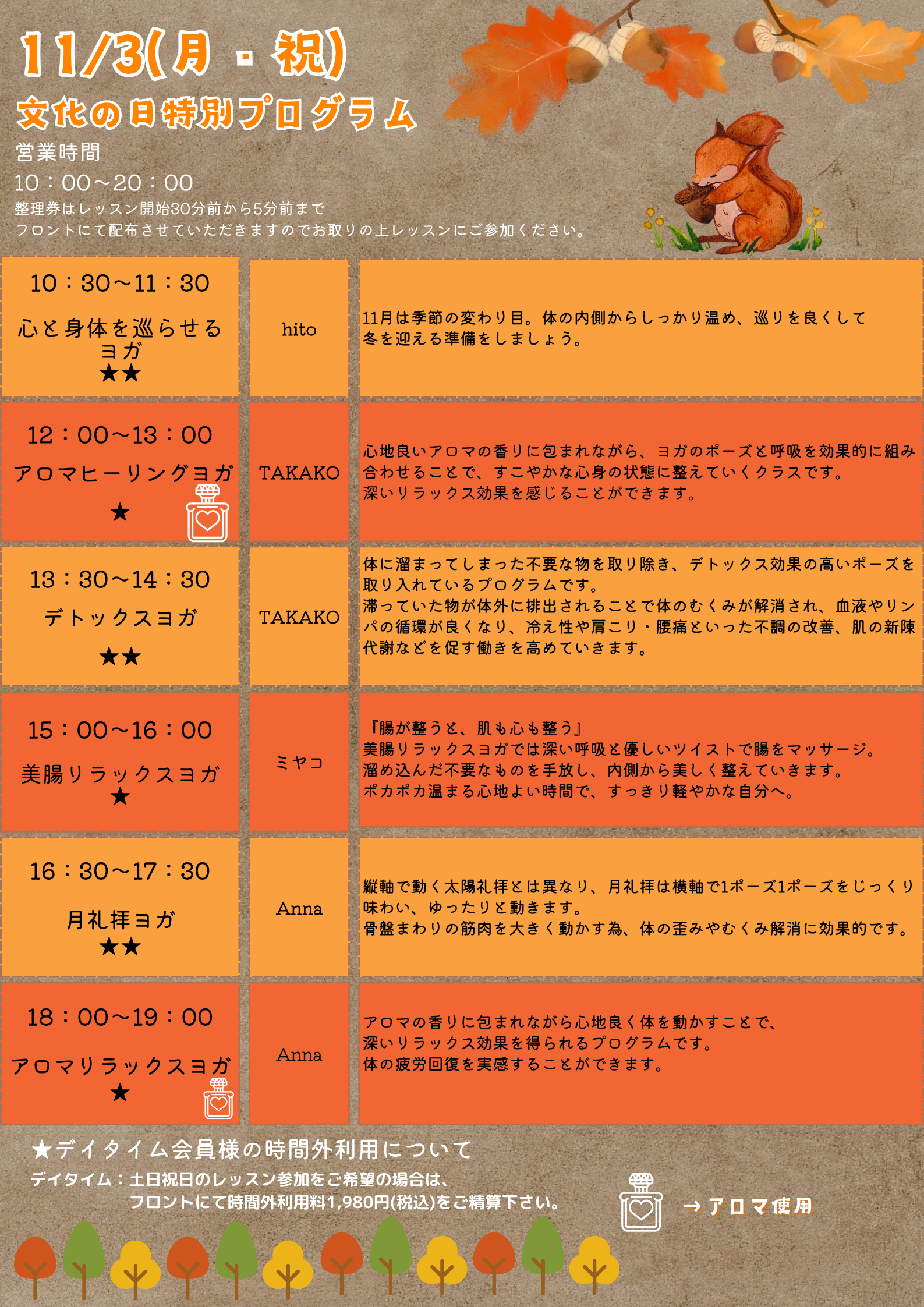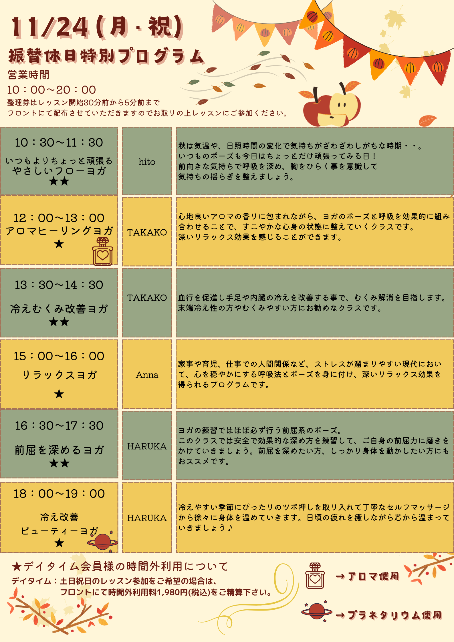 ホットヨガによる血液やリンパの流れを促進する効果に加え、ホルモンバランスの安定や美肌効果、たるみ解消など、さまざまな角度からのボディケアを目的としたプログラムです。難度は低めに設定していますので、初心者でも安心して受講することができます。