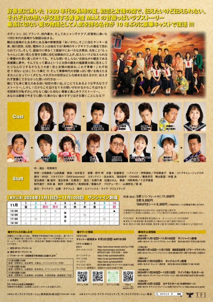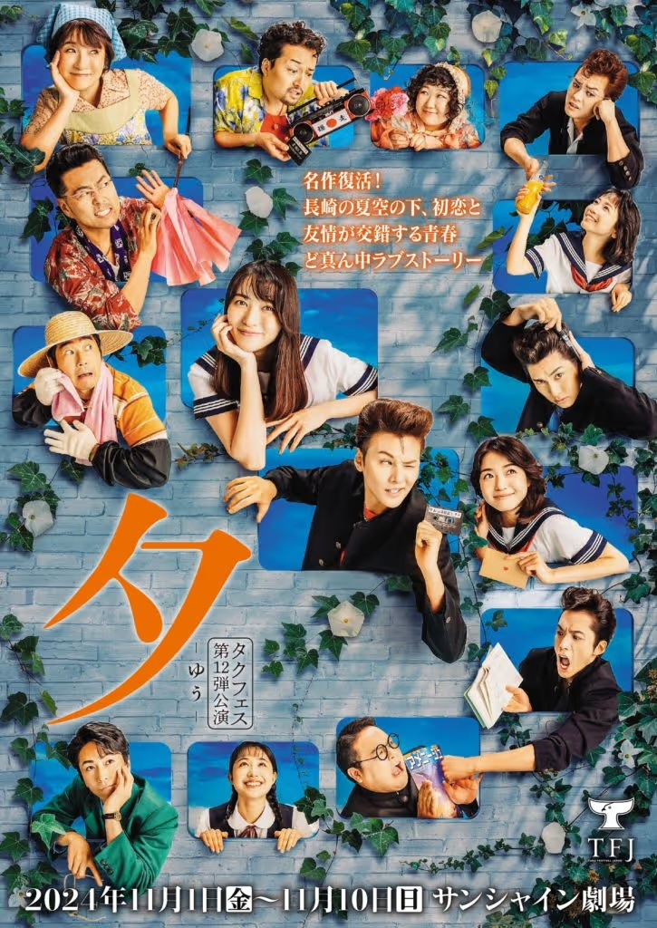 タクフェス第12弾公演『夕』最高に切ない夏の物語として、人気を誇る名作が10年ぶりに豪華キャストで復活! 長崎の夏空の下、初恋と友情が交錯する青春ど真ん中ラブストーリー。 チケットには限りがありますのでお早めに!https://takufes.jp/yuu2024/