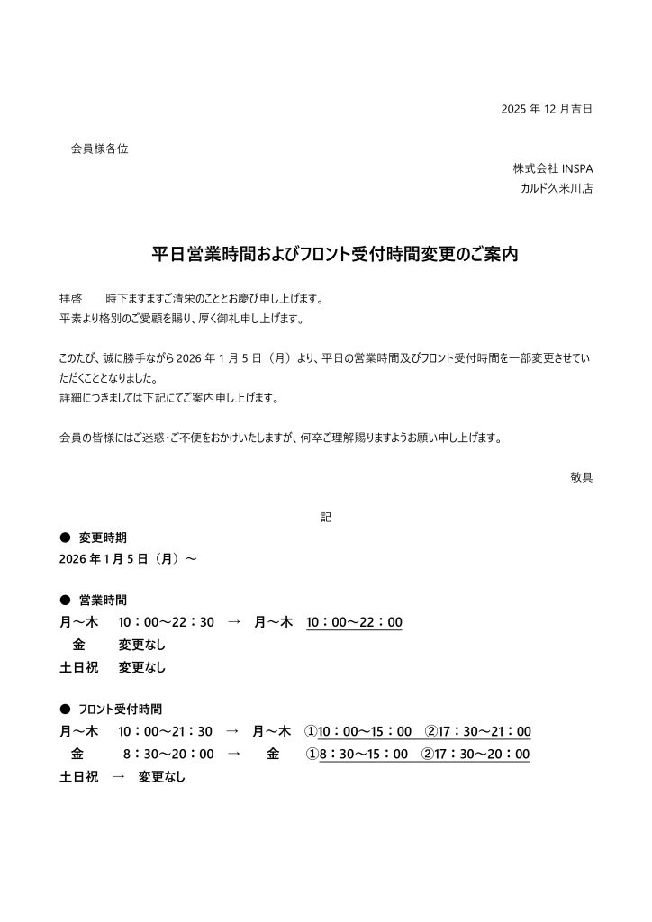 重要なお知らせ(営業時間・フロント受付時間変更)※11/30更新