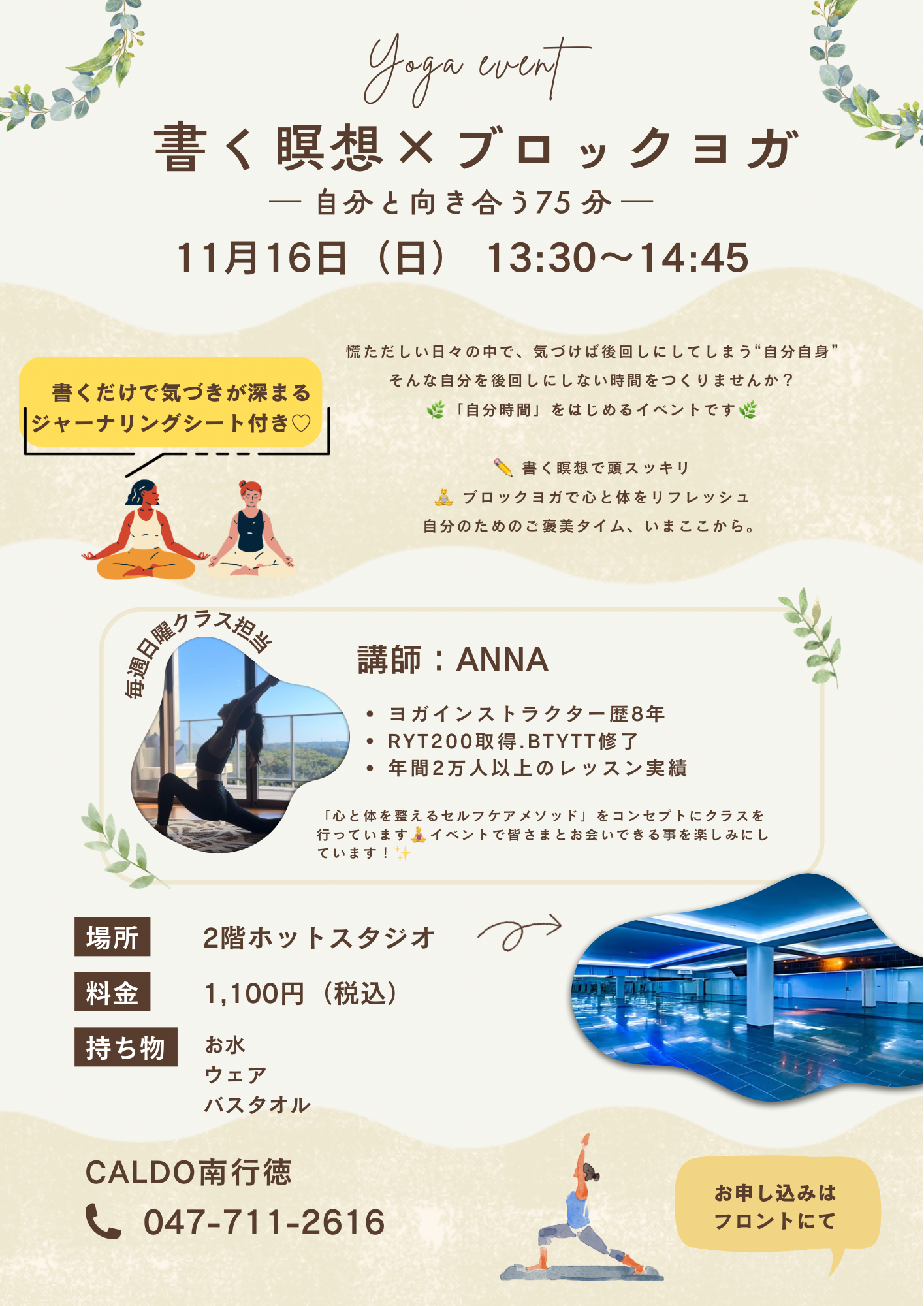 少ないポーズ数をゆっくり流れるように動いていきます。 運動に自信が無い方やヨガを始めたばかりの方でも安心してご参加いただけます。