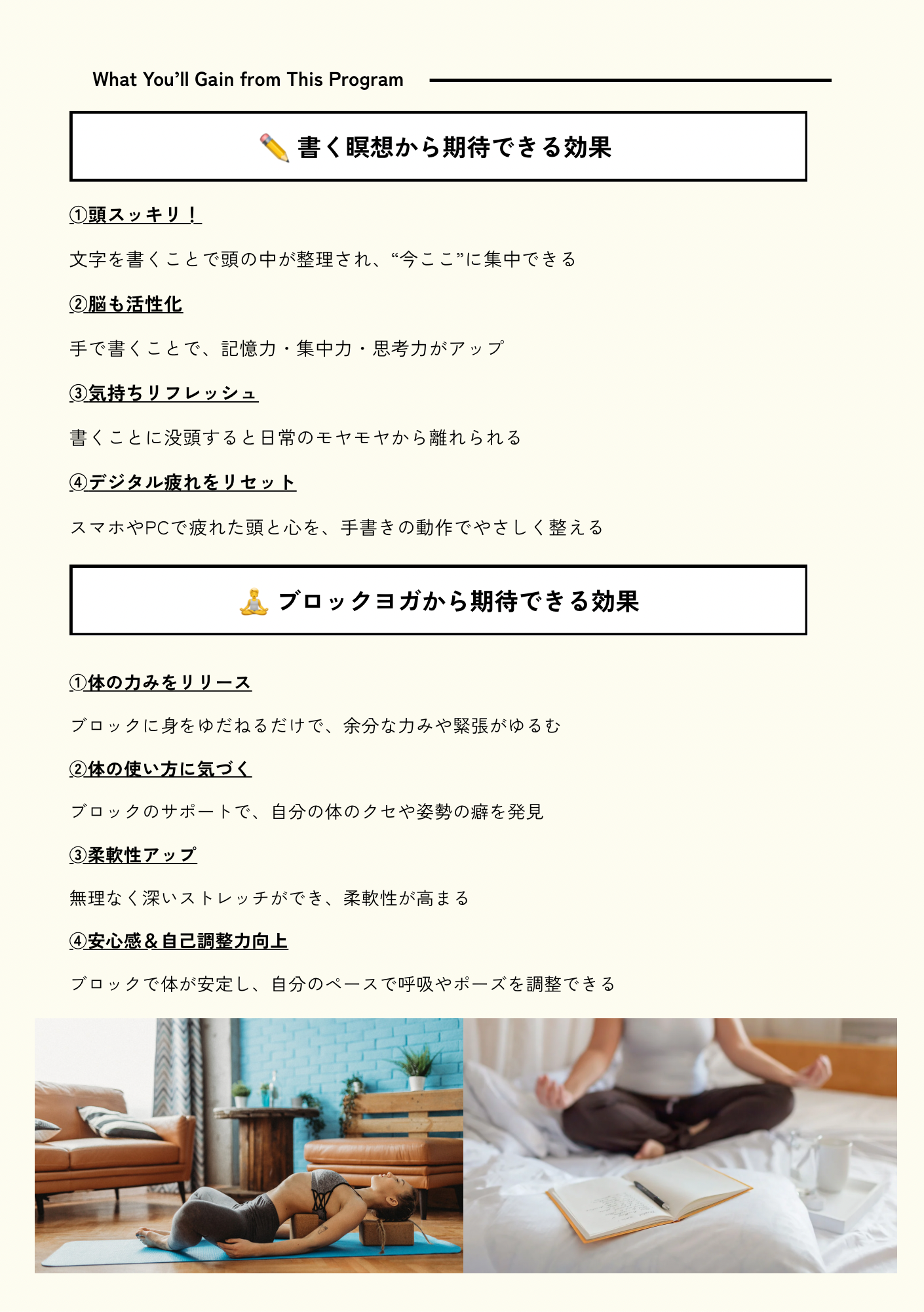 家事や育児、仕事での人間関係など、ストレスが溜まりやすい現代において、心を穏やかにする呼吸法とポーズを身に付け、深いリラックス効果を得られるプログラムです。