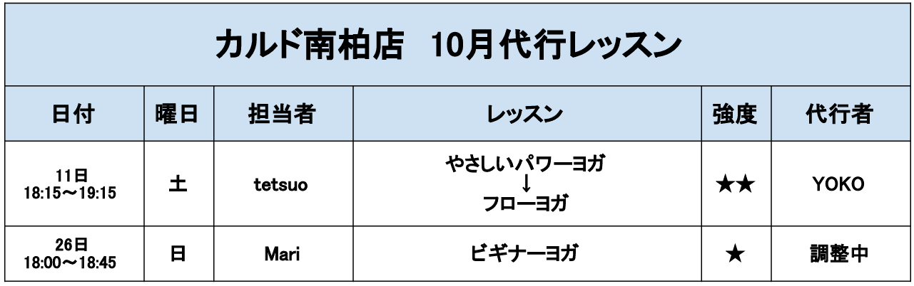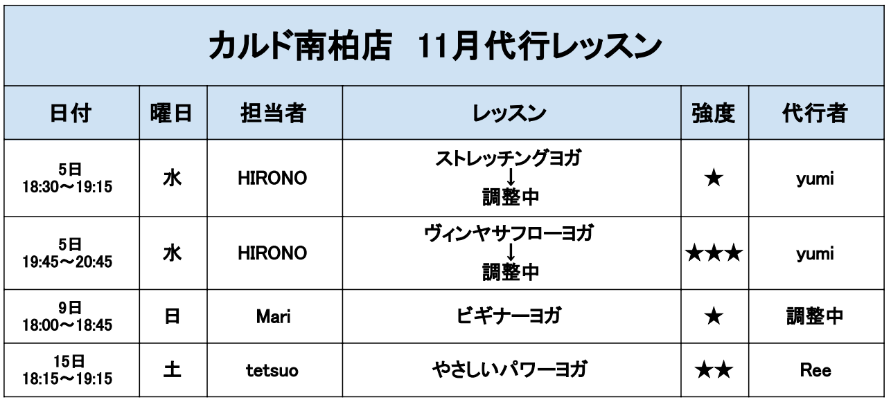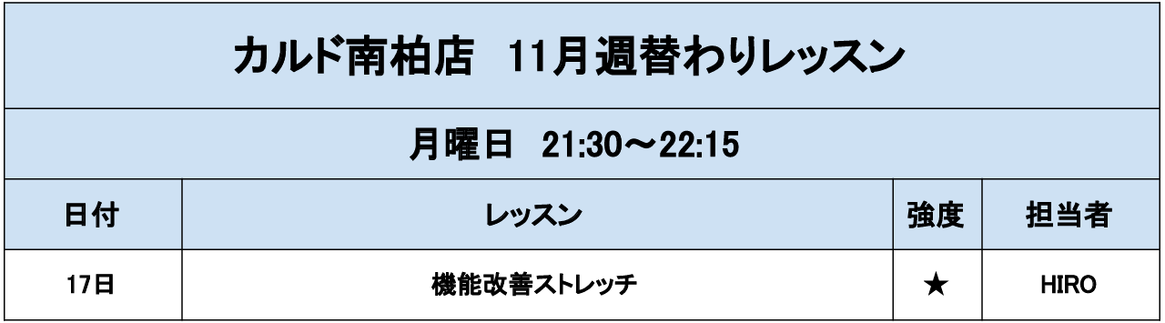 12月のテーマは『鳩のポーズ』、1月のテーマは『体幹』です。 ※代行の際はテーマはございません。 ヨガのポーズを用いて、体調を総合的に整える事を目的としたプログラムです。 呼吸とともに身体を動かし、緊張した筋肉を伸ばすポーズを中心に行います。