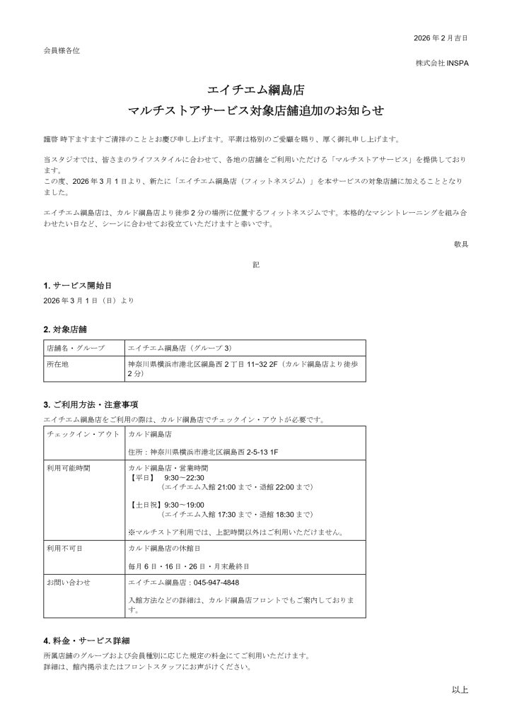 エイチエム綱島店 マルチストアサービス対象店舗追加のお知らせ