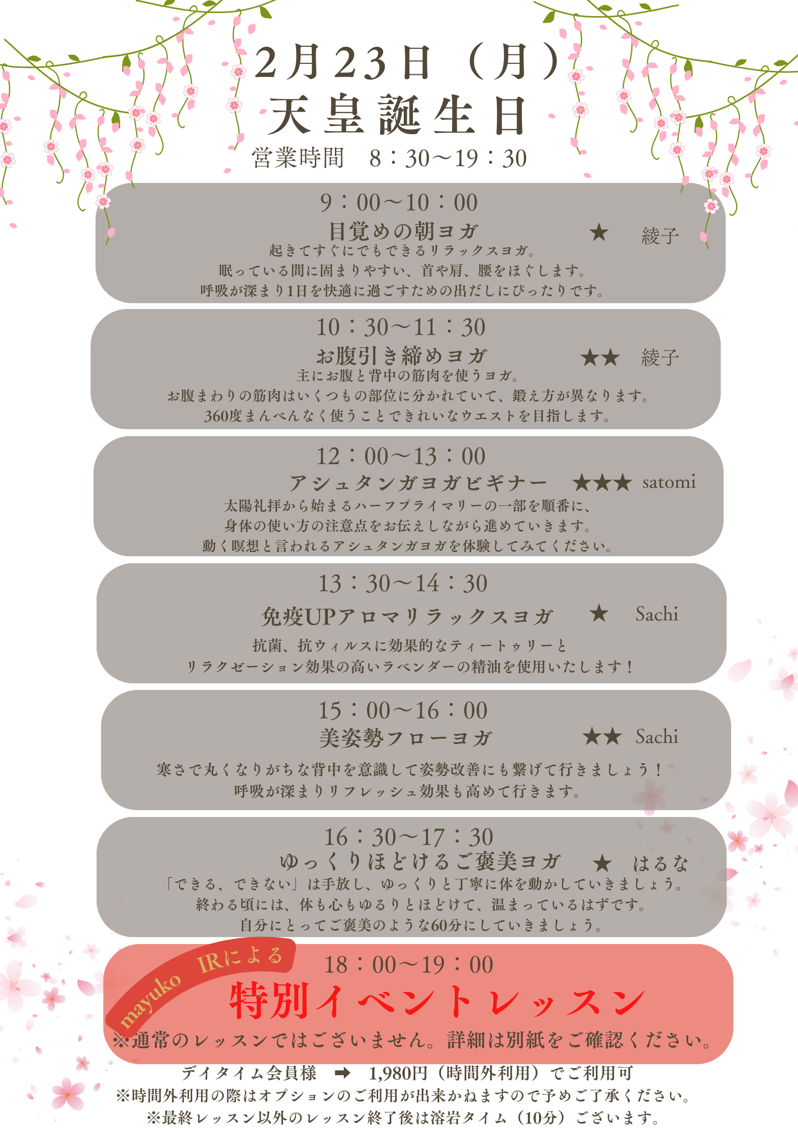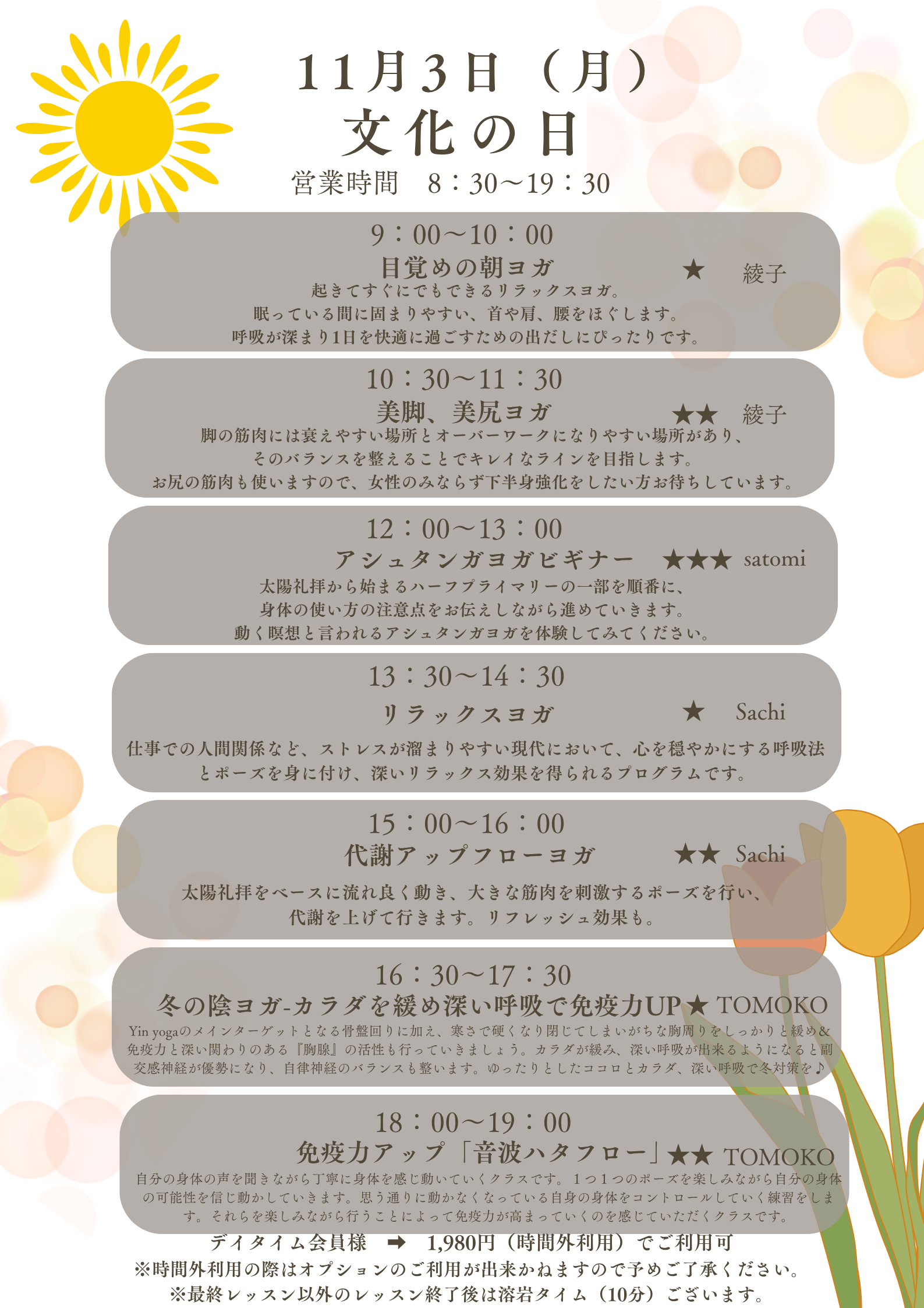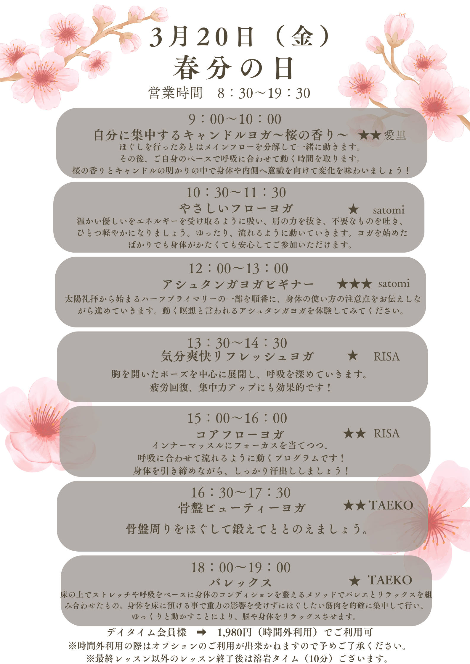 少ないポーズ数をゆっくり流れるように動いていきます。運動に自信が無い方やヨガを始めたばかりの方でも安心してご参加いただけます。