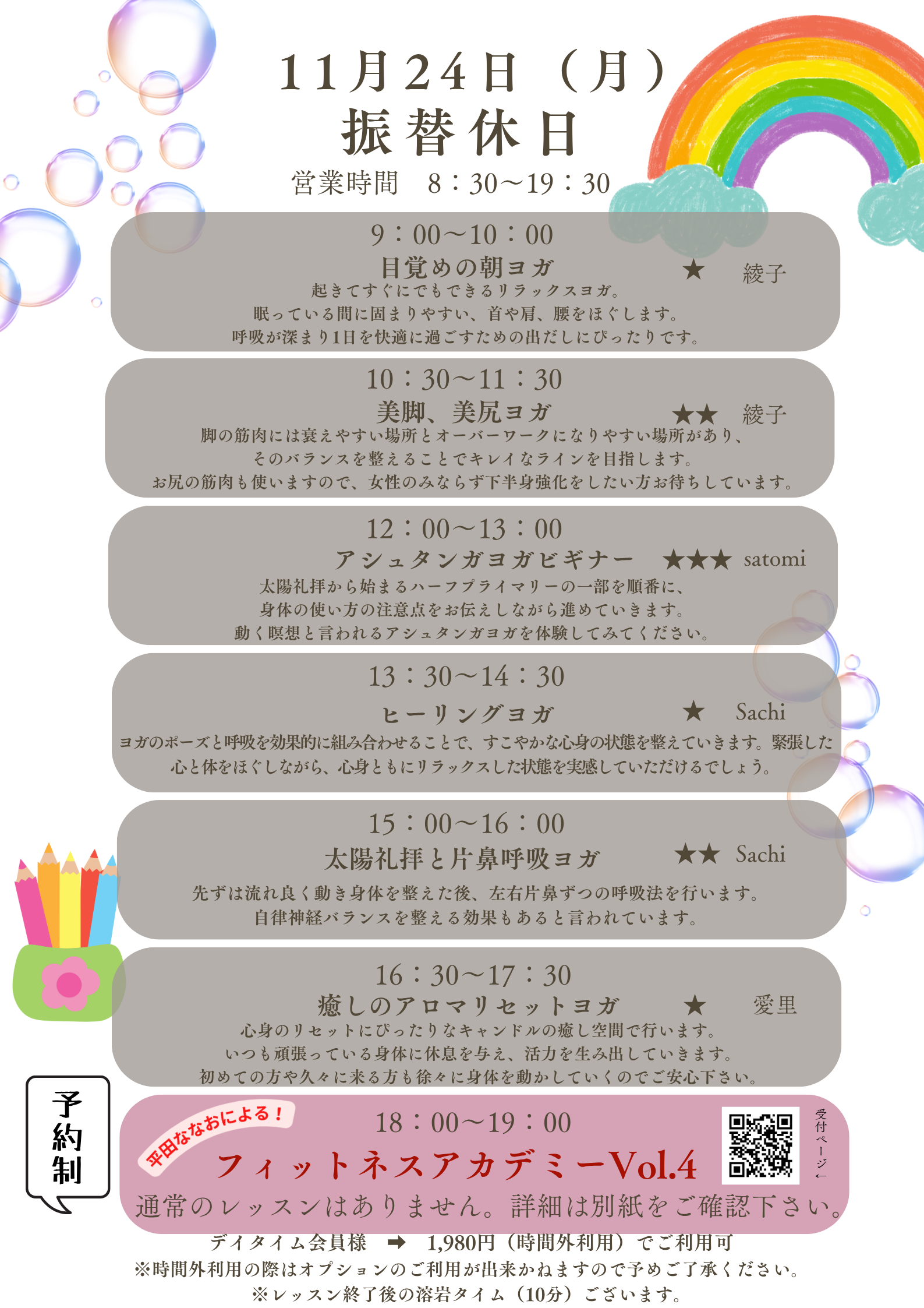 ホットヨガによる血液やリンパの流れを促進する効果に加え、ホルモンバランスの安定や美肌効果、たるみ解消など、さまざまな角度からのボディケアを目的としたプログラムです。難度は低めに設定していますので、初心者でも安心して受講することができます。