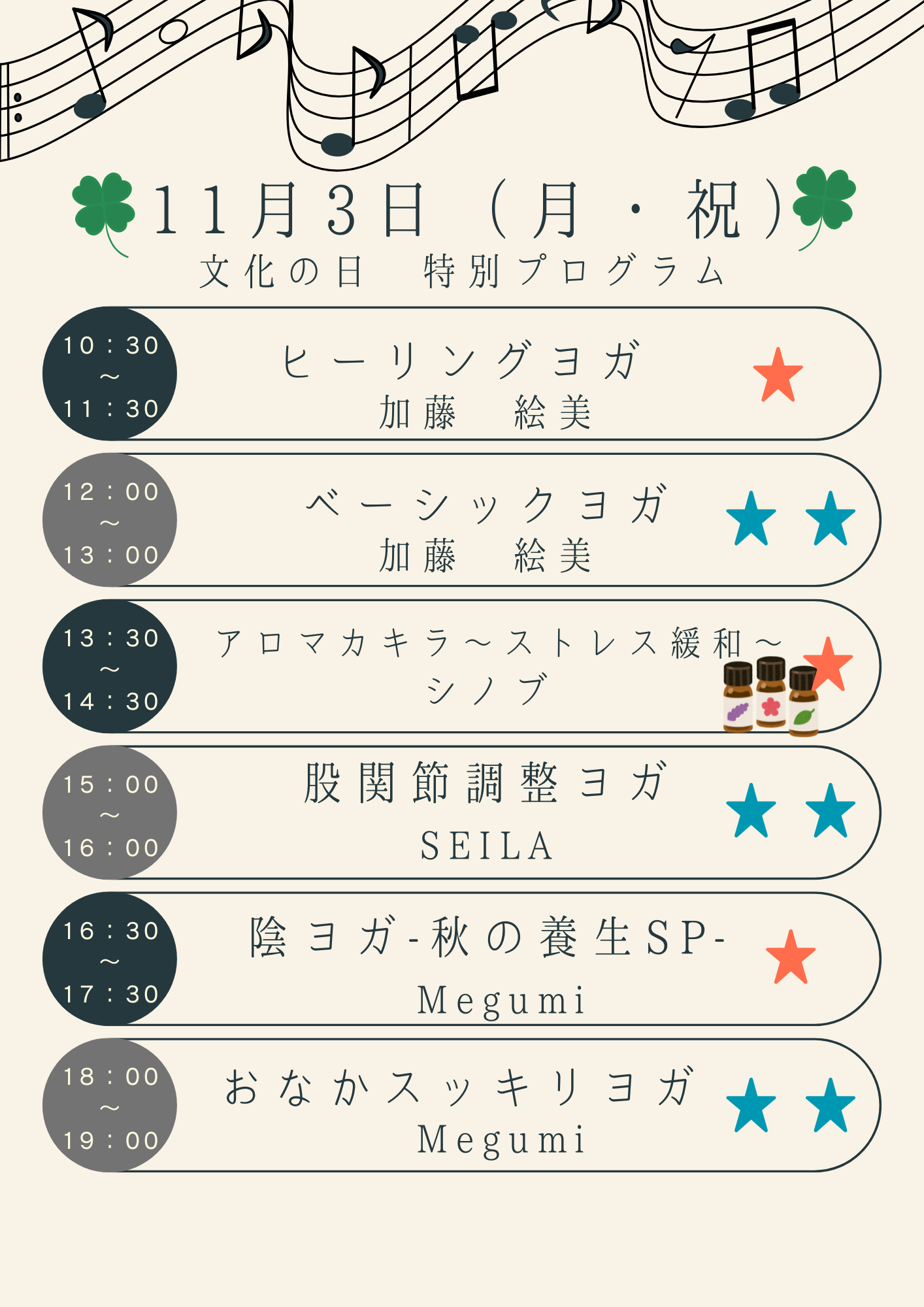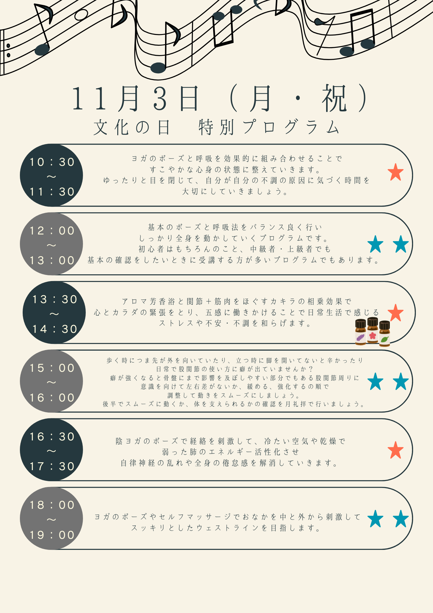 アロマの香りに包まれながら、ゆっくりとポーズを行っていくクラスです。アロマの香りの効果で気持ちを落ち着かせたり、リフレッシュしたり、深くリラックスしていきます。