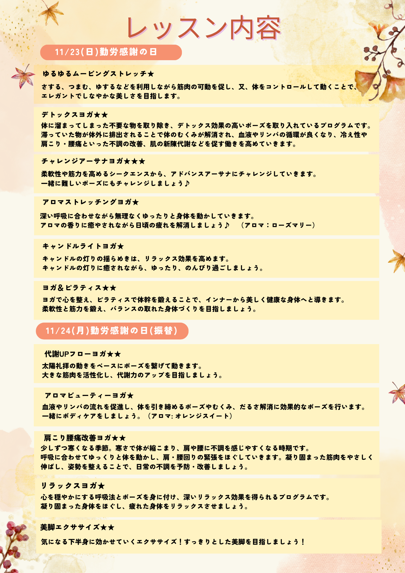 アロマの香りを感じながら、心を穏やかにする呼吸法とポーズを身に付け、 深いリラックス効果を得ることができるプログラムです。初心者の方でも安心です。