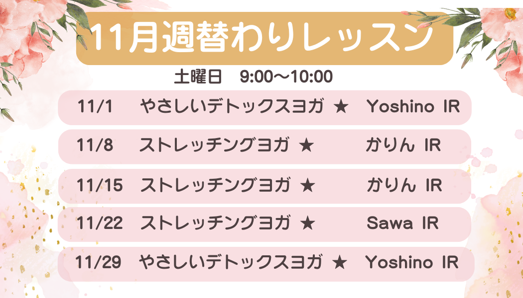 少ないポーズ数をゆっくり流れるように動いていきます。運動に自信がない方やヨガを始めたばかりの方でも安心してご参加いただけます。