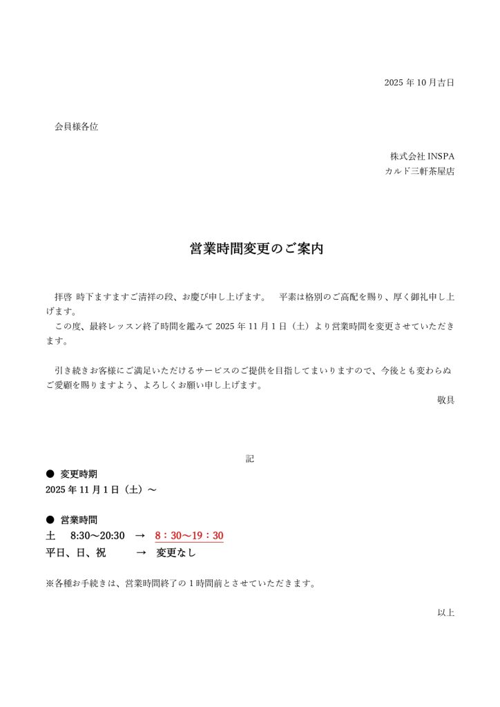 営業時間変更のお知らせ