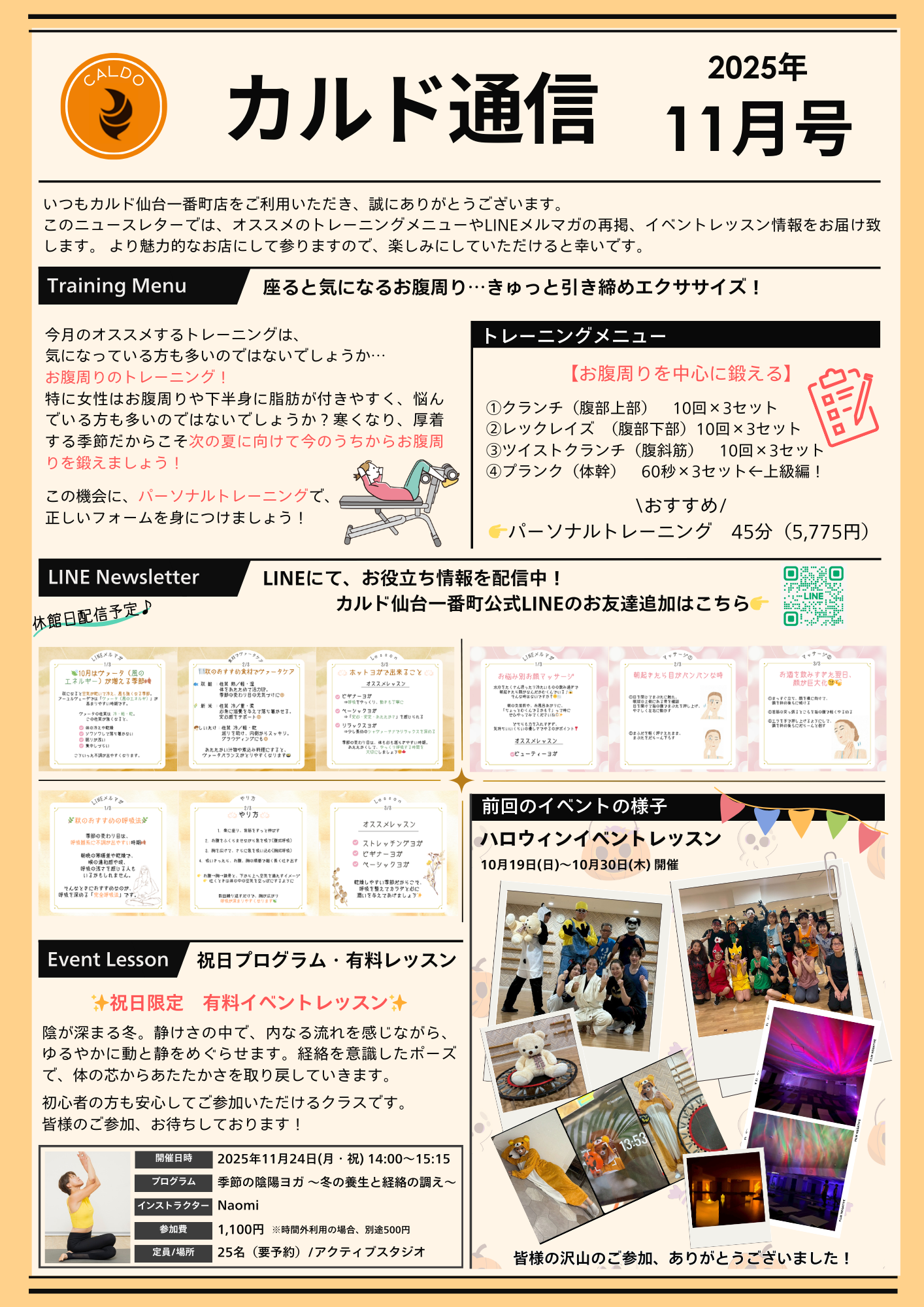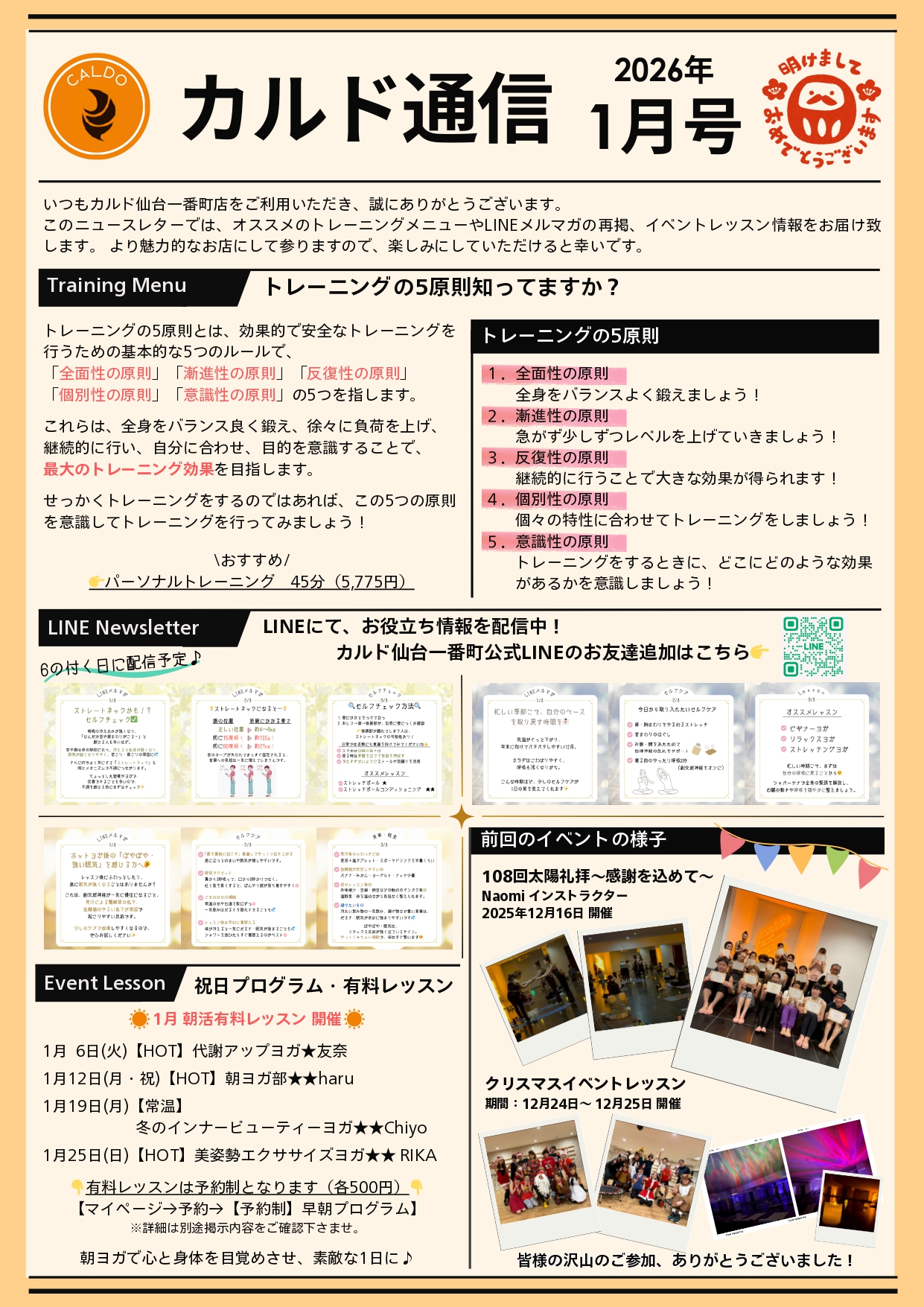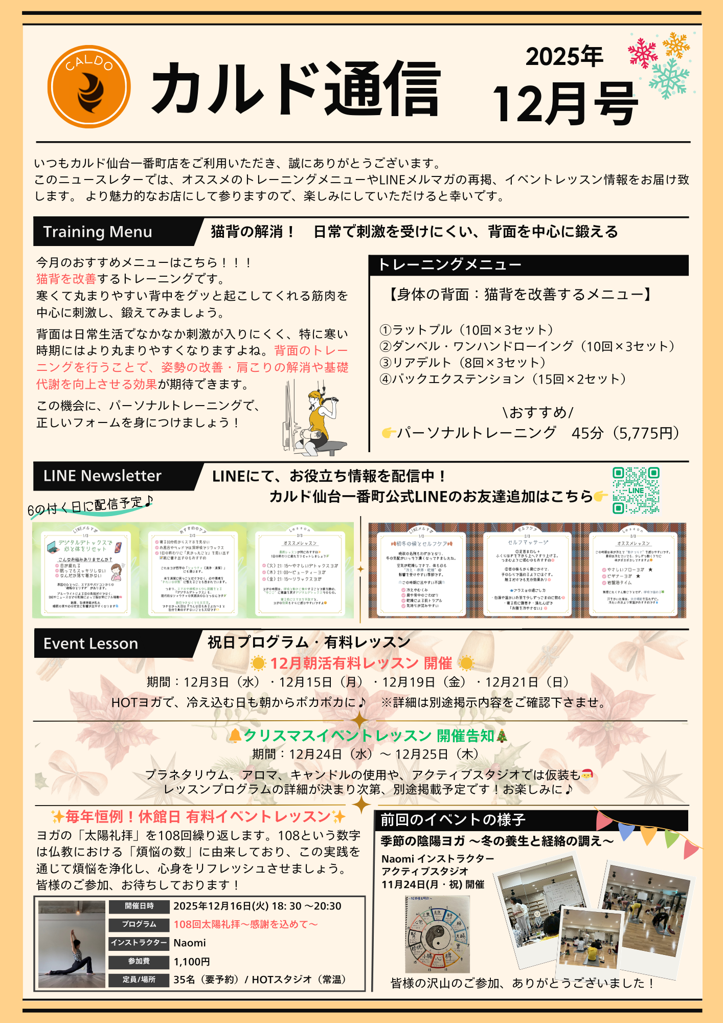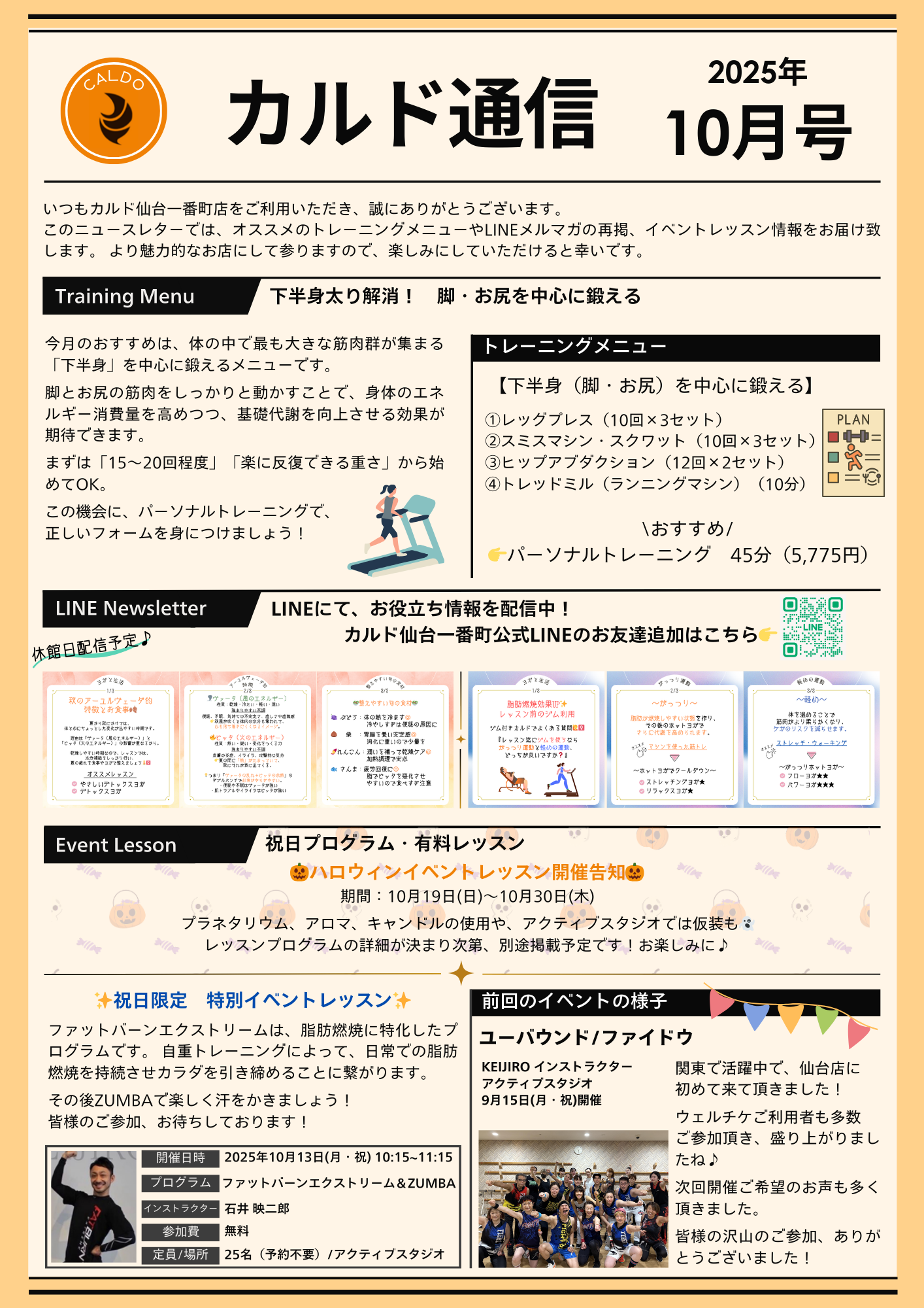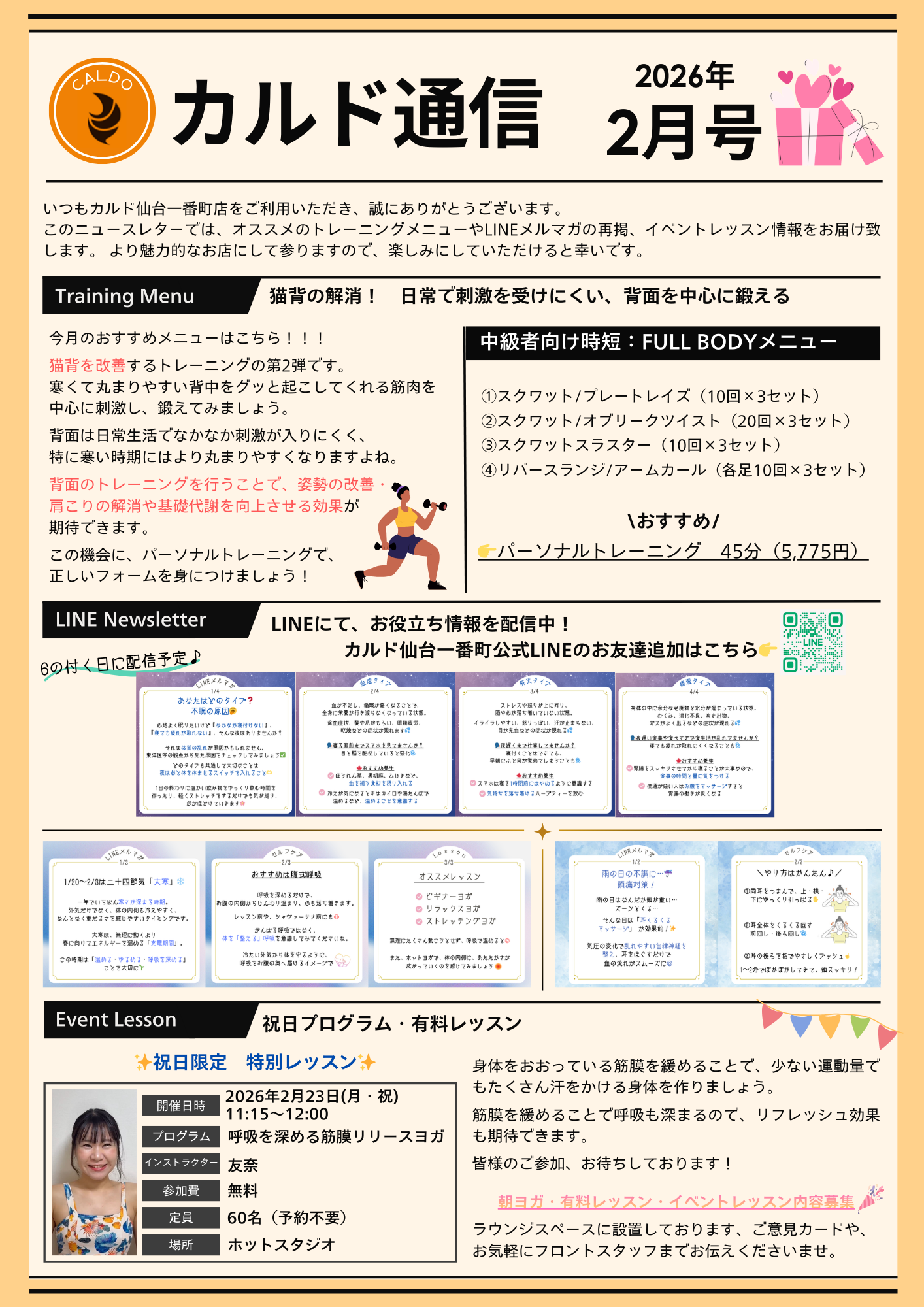 いつもカルド仙台一番町店をご利用いただき、誠にありがとうございます。カルド通信では、オススメのトレーニングメニューやLINEメルマガの再掲、イベントレッスン情報をお届け致します。 より魅力的なお店にして参りますので、楽しみにしていただけると幸いです。